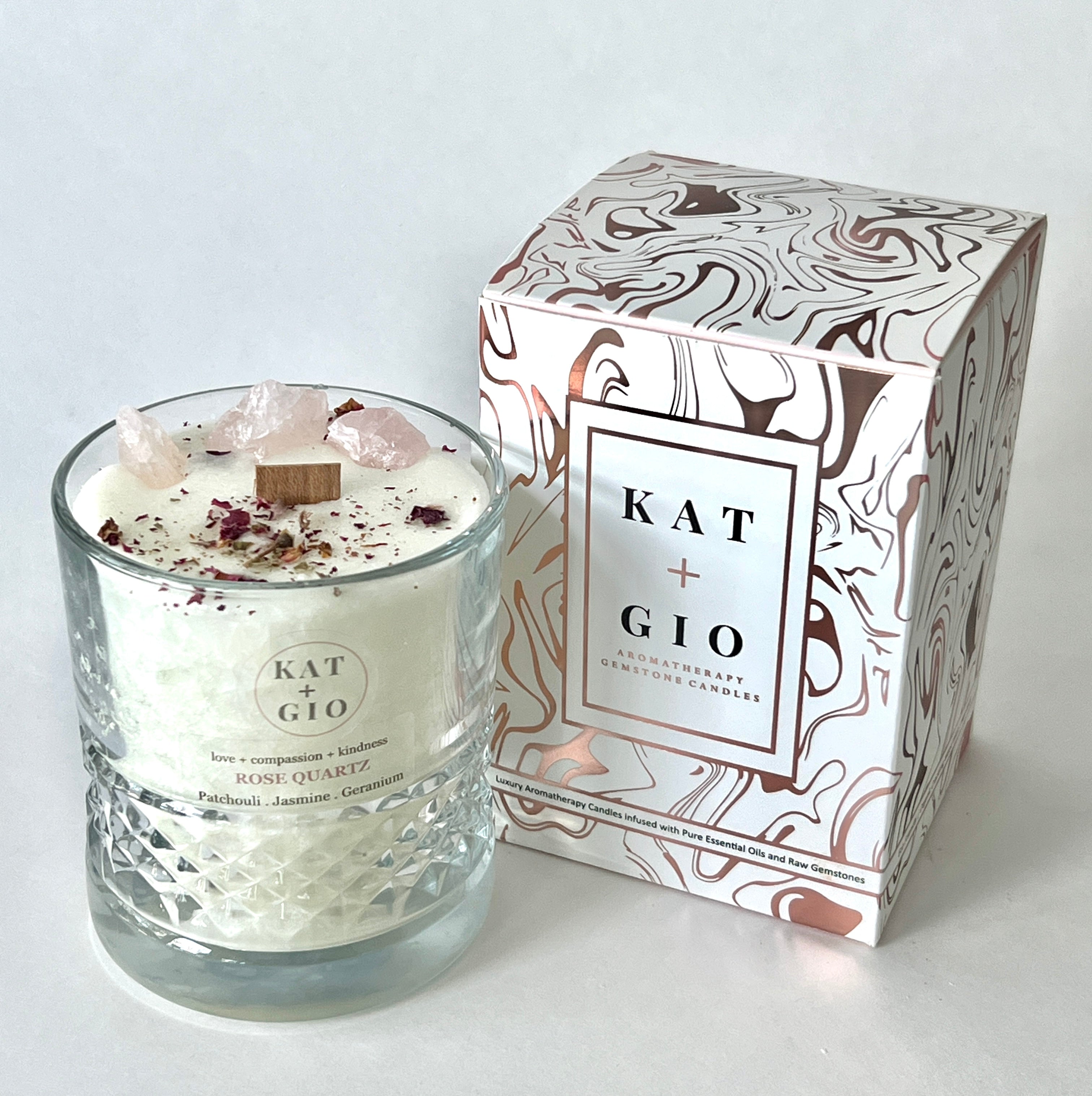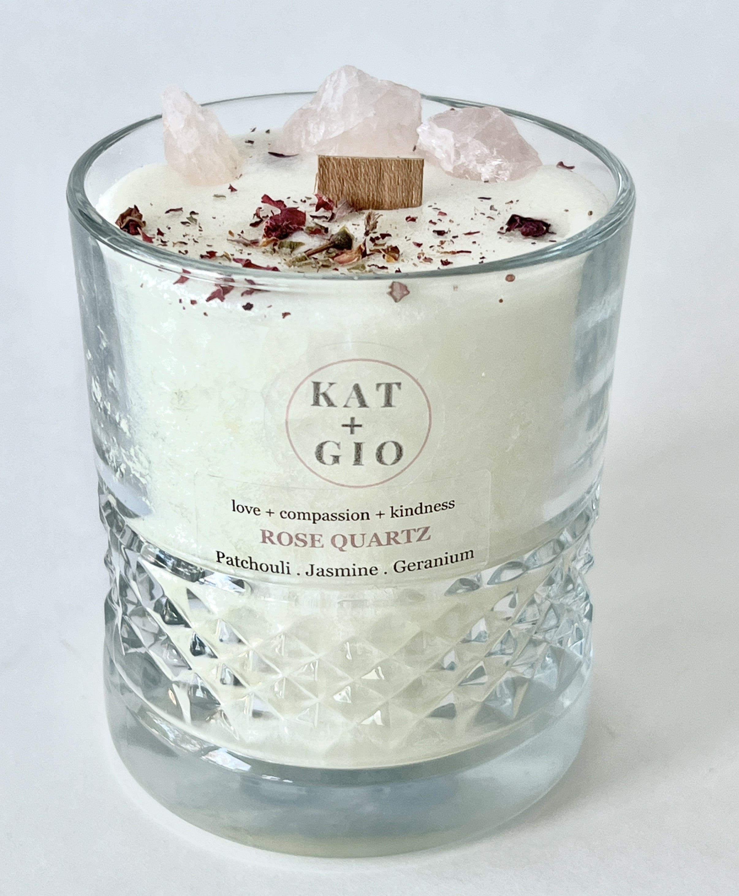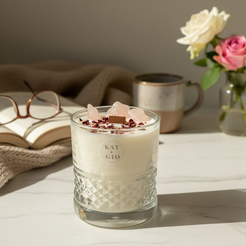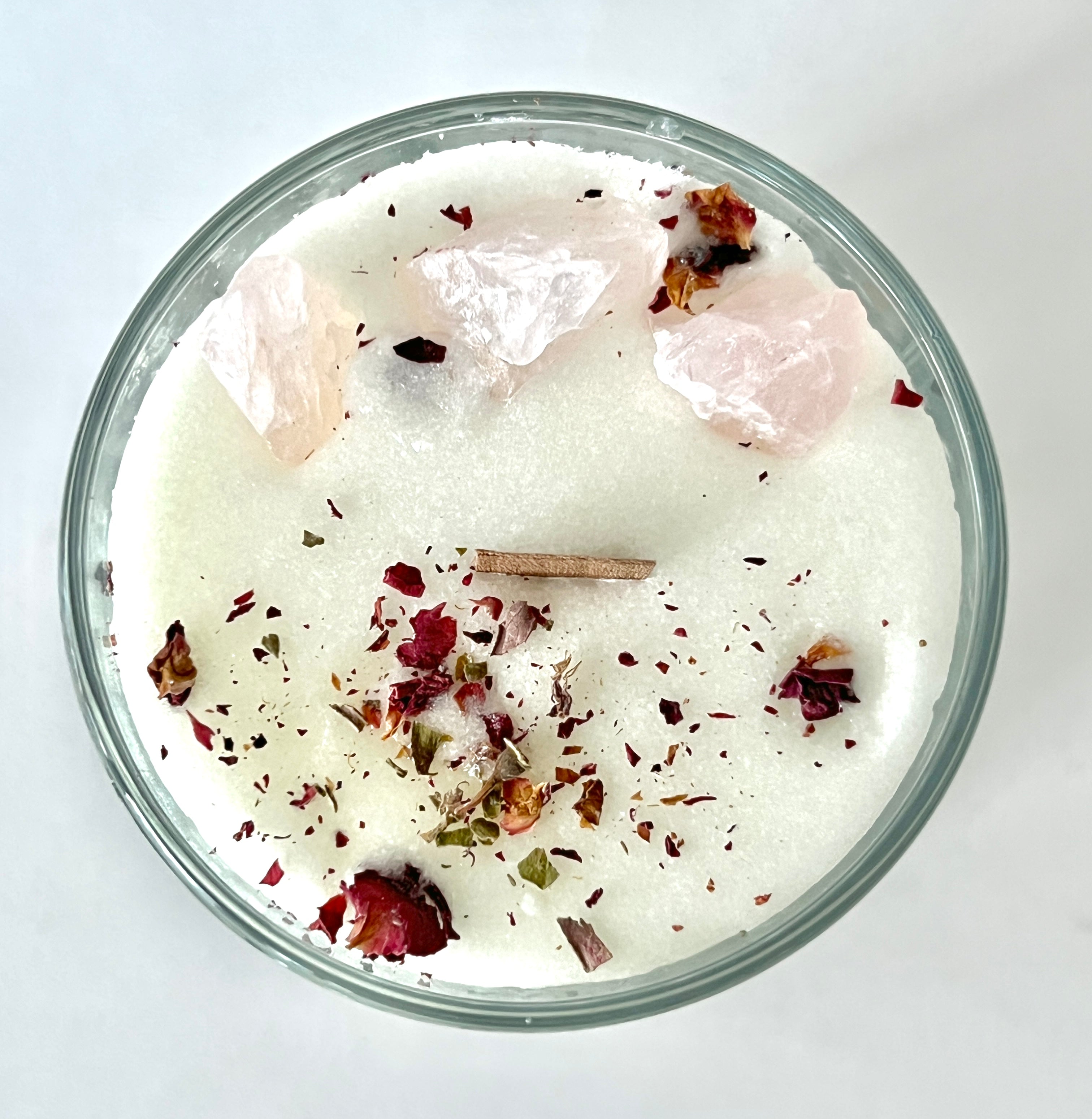 Embrace the healing energy of Rose Quartz with this luxury scented candle. Handmade with genuine healing crystals, sustainable palm wax, and a crackling wood wick, this aromatherapy candle blends pure essential oils to create a romantic, grounding atmosphere. Hand-poured in Winnipeg, Canada.